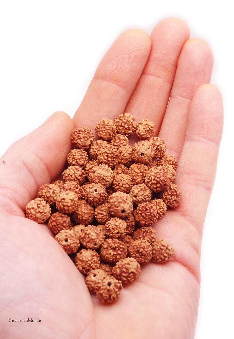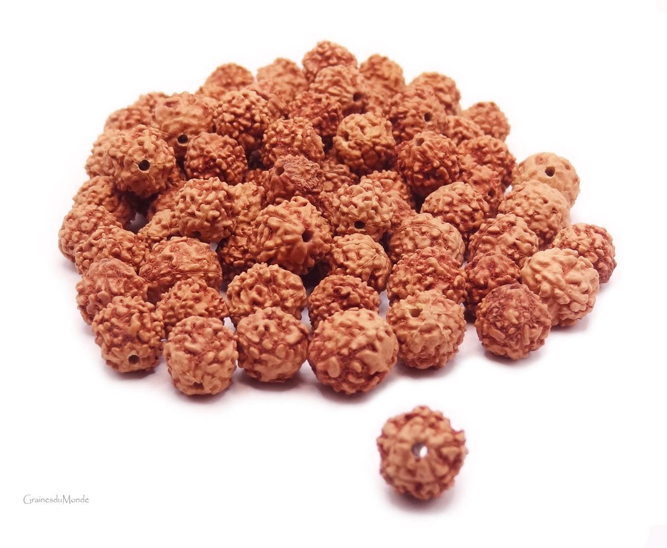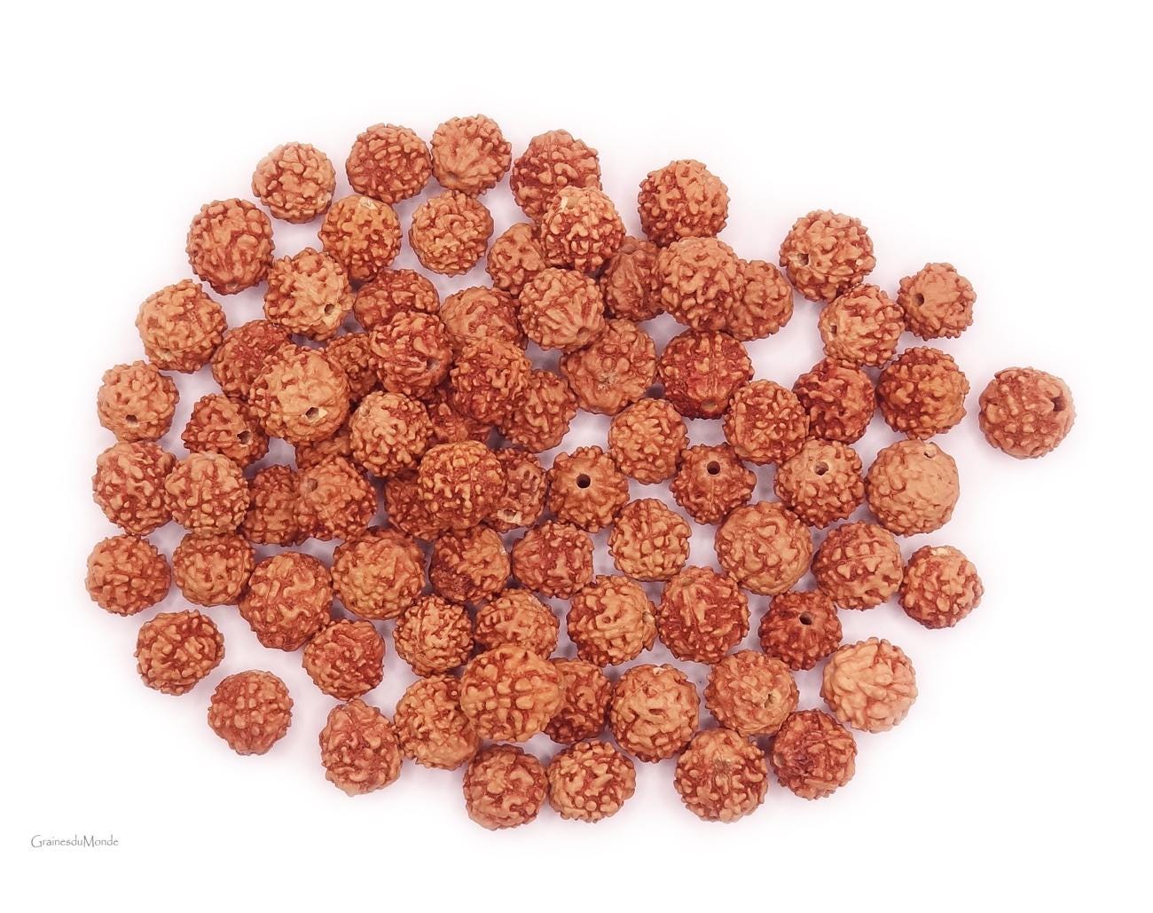25 grams of raw Rudraksha (Elaeocarpus ganitrus) or approximately 80 seeds of 8, 9 and 10mm in diameter, pierced 1,3mm, undyed, ungreased, origin: Indonésie.