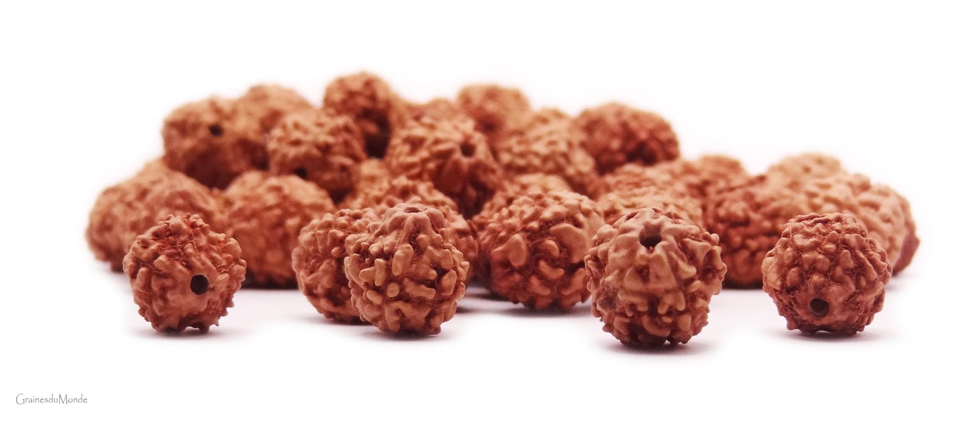 Beneficial virtues are attributed to Rudraksha which emit electromagnetic waves. Commonly used for making rosaries in Asia (mâlâ), their radiation would strengthen our own energy field. The virtues attributed to them vary depending on the number of faces (Mukhi) they contain. The most common 5 Mukhi represents the 5 faces of Shiva, it would bring protection, balance, awakening, serenity and peace.
