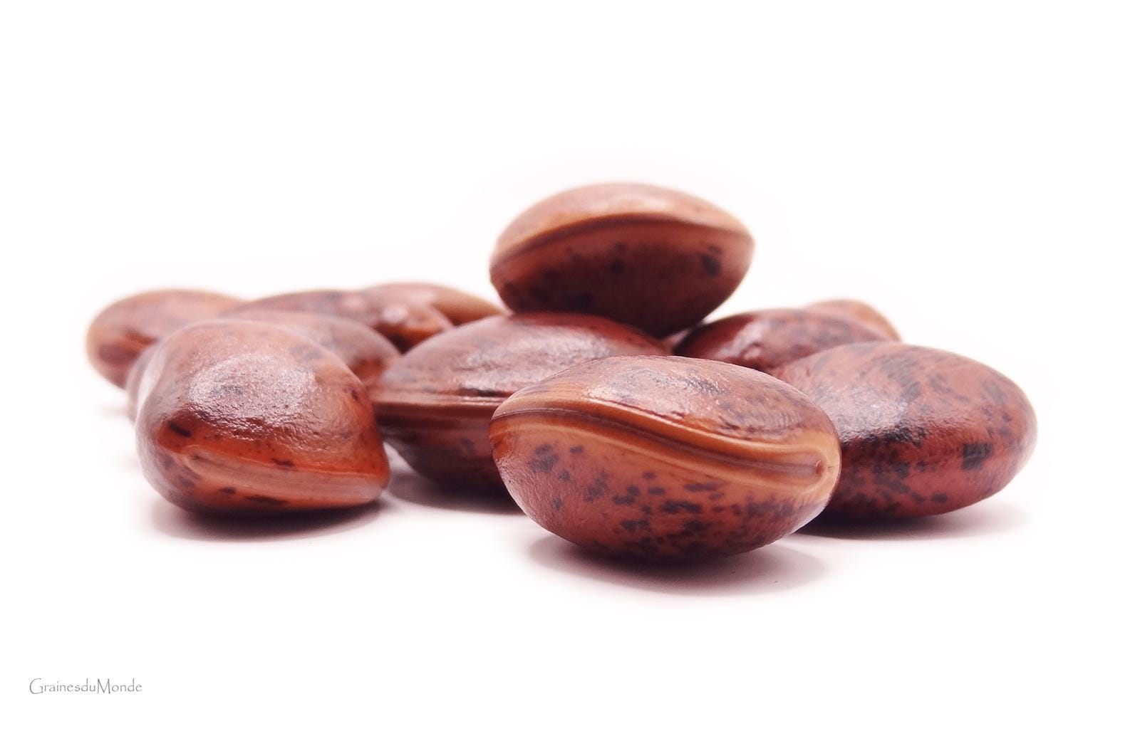 There are a hundred species of Mucuna and about fifty specie of Macropsychanthus, all producing marble-like seeds particularly hard. English common names include bull’s eye seed, hamburger bean or sea purse depending on the variety.